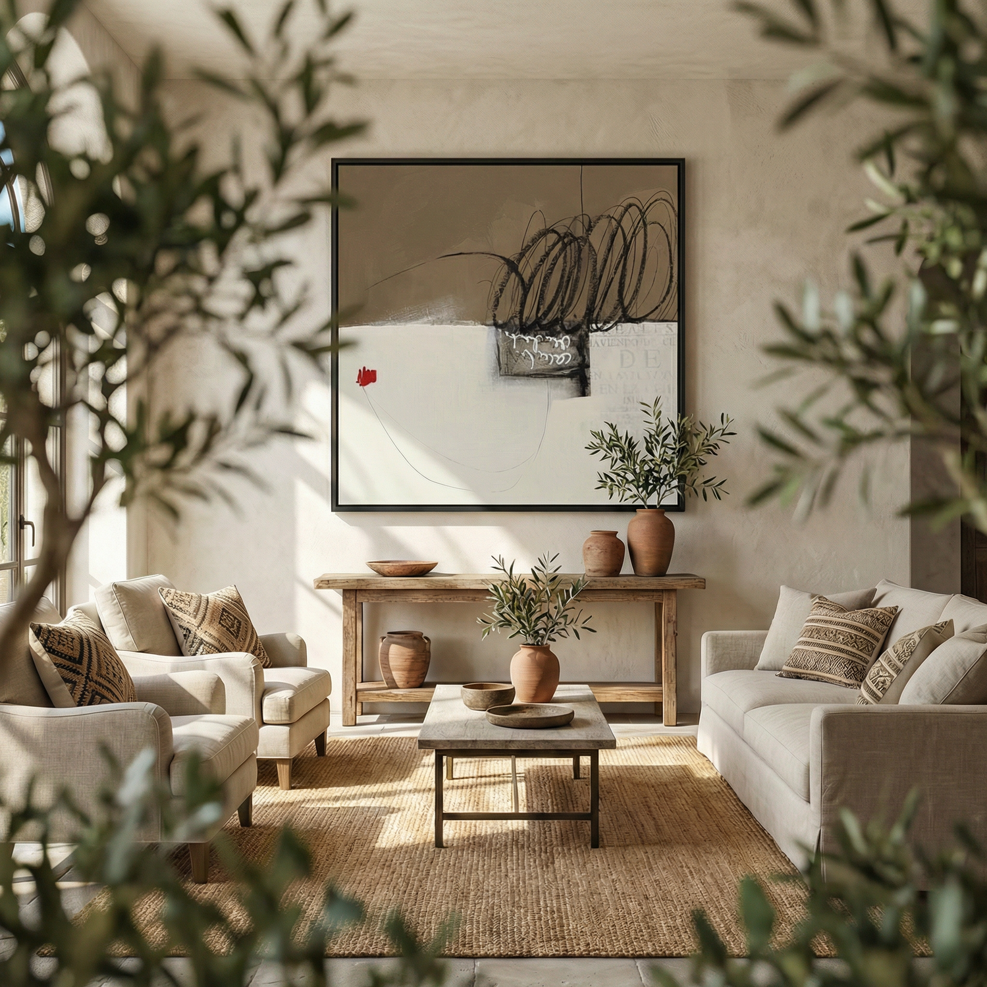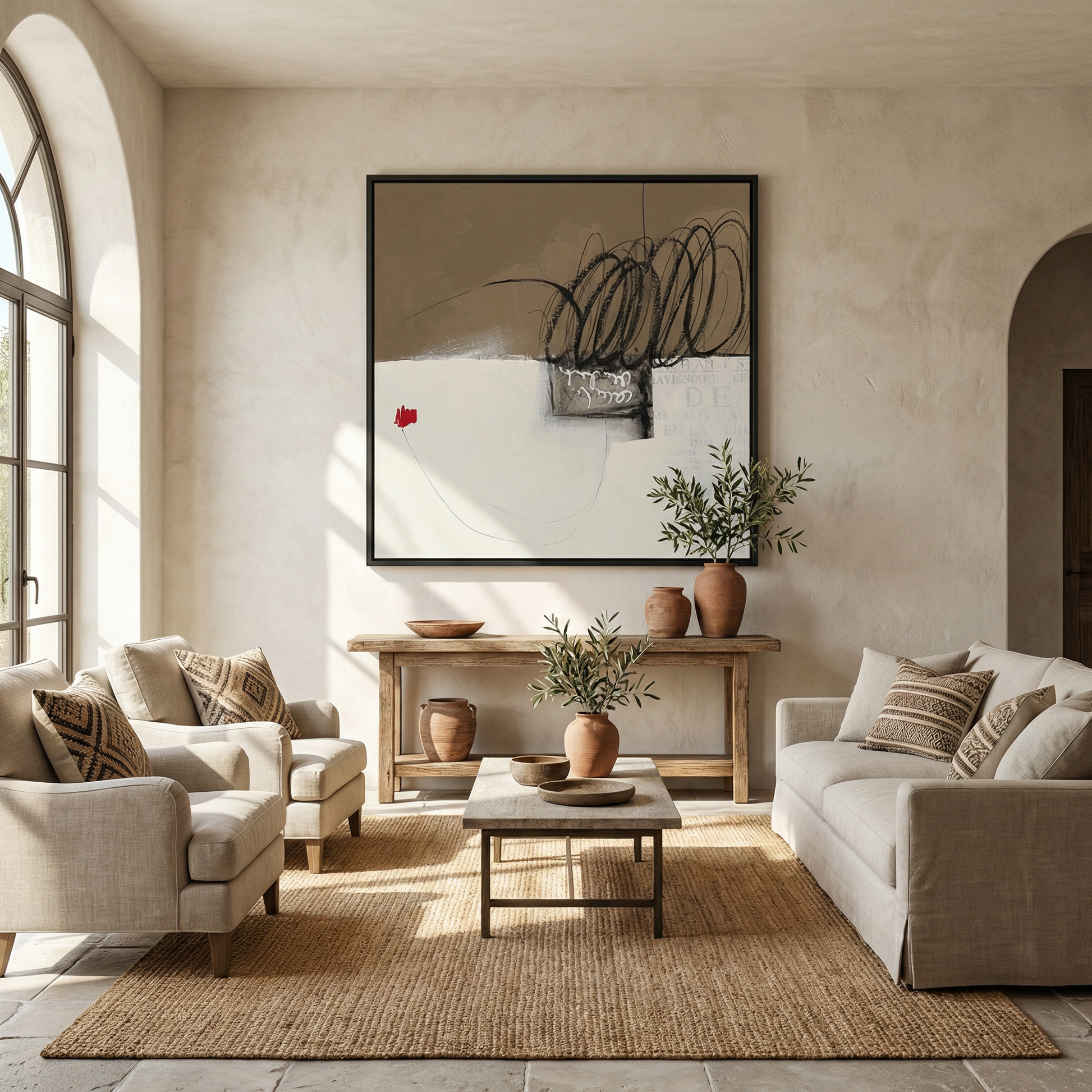 Au centre, des textures et des superpositions discrètes évoquent des fragments de mémoire, comme des traces d’histoires anciennes portées par le vent. Une petite touche de rouge apparaît comme un signe de vie dans cette étendue paisible, apportant contraste et émotion à la composition.
